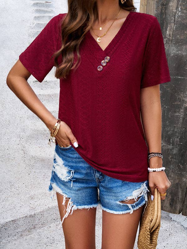 Material 95% Polyester Style Loose , Short Sleeves Feature Buttoned , Hollow , Split-joint Neckline V-neck Occasion Casual , Leisure Fashion Seasons Spring , Summer Type T-Shirts Tops Color PINK,WHITE,GREEN,BURGUNDY Size S,M,L,XL Please consult the size chart we provide for this item's measurements to help you decide which size to buy.Please note: There may be 1-3cm differ due to manual measurement.
