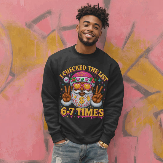 Our Nice List Certified™ Santa Drip Holiday Crewneck & Tee features a flashy, fly Santa rocking designer shades, money-chain bling, heart details, and double peace signs with the bold statement: